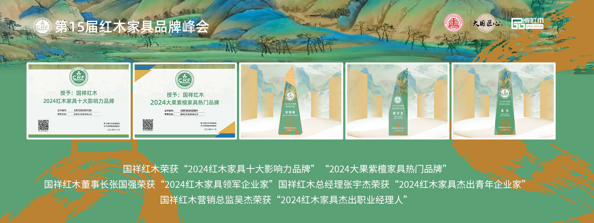 在多年的發(fā)展歷程中,國(guó)祥紅木憑借卓越的產(chǎn)品品質(zhì)和服務(wù)質(zhì)量,先后榮獲了紅木家具十大影響力品牌、浙江省知名商號(hào)、浙江省名牌產(chǎn)品 、浙江省林業(yè)重點(diǎn)龍頭企業(yè)、浙江省消費(fèi)者信得過(guò)單位 、浙江省家具行業(yè)先進(jìn)企業(yè)、東陽(yáng)市木雕紅木家具骨干企業(yè)、中國(guó)紅木老品牌、東陽(yáng)市木雕紅木家具骨干企業(yè)、東陽(yáng)市木雕紅木家具十大精品企業(yè)等眾多榮譽(yù),用實(shí)力詮釋了老字號(hào)品牌的活力。