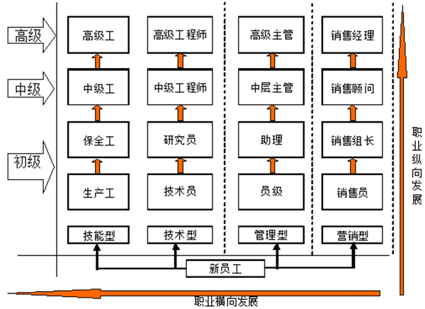 為使不同能力素質、職業(yè)興趣的員工都可以找到適合自己的上升路徑,公司明確了不同職系的晉升評估、管理辦法,為員工提供”橫向”、”縱向”并存的雙軌制職業(yè)發(fā)展通道,充分給予員工不斷上升的機會。員工可根據自身的實際情況選擇”縱向發(fā)展、橫向發(fā)展、綜合發(fā)展”三種職業(yè)生涯發(fā)展方式。