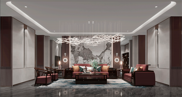 紅酸枝材質(zhì)的溫潤色澤,在燈光的烘托下給客廳空間帶來溫暖的格調(diào),放大客廳的親切感,描繪中式的精致典雅。